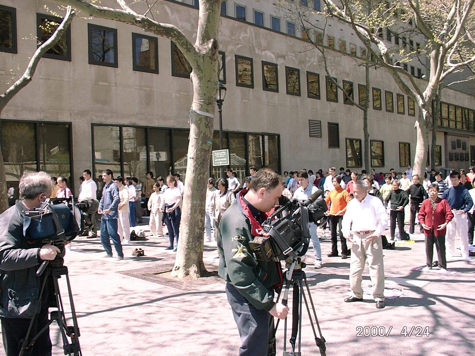 一周阴雨连绵之后,24日的纽约阳光灿烂,春意盎然。两百名左右法轮功学员在“4.25”一周年到来之际在联合国大厦门前的公园里进行了集体炼功。从早上10点至下午两点,大家通过连续不断炼功的方式表达对“4.25”纪念日的敬意并向公众弘法。祥和悠扬的大法音乐,和平的炼功场面吸引了不少游客驻足观瞧。世界日报、美国之音、BBC等主要西方媒体在现场做了详细采访并录音录像。
