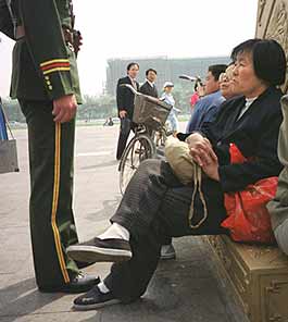 上万法轮功学员和平情愿要求中央政府给予法轮功合法地位一周年的前夕。图中坐在广场上休息的两位法轮功女学员随后被警察带走。自从法轮功于去年七月被中国政府宣布为非法组织后,法轮功学员的抗议活动一直没有停止。