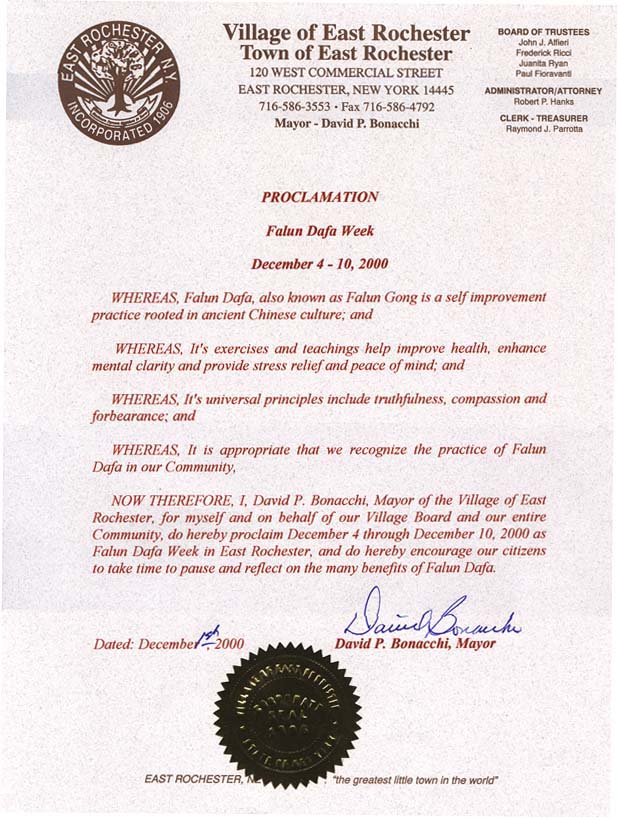 有鉴于,在我们社区肯定法轮功的修习是恰如其分的,因此,我,大卫。波那奇,东罗彻斯特村行政长官,特此代表我个人,村董事会,及我们整个社区,宣布2000年12月4日至12月10日为东罗彻斯特法轮大法周,并且鼓励我们的公民能花些时间,停下来深思一下法轮功的诸多益处。