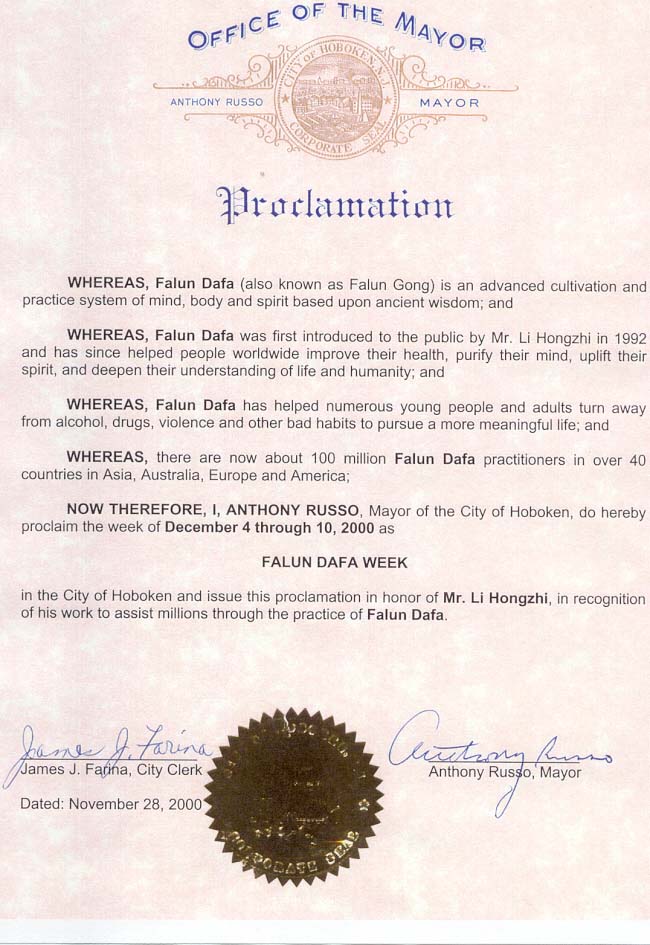 新泽西州霍伯根市市长Russo先生为表彰李洪志大师帮助数百万人民修炼法轮大法,及法轮大法对世界人民的贡献,决定宣布2000年12月4-10日为霍伯根市“法轮大法周”。