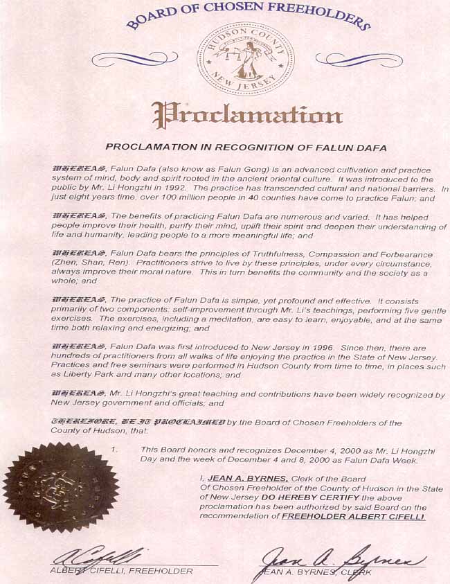 继新泽西州哈德逊(Hudson)县行政执行官Janiszewski先生发布“法轮大法周”及对李洪志大师的嘉奖令后,哈德逊县县议会也于近日宣布2000年12月4日为哈德逊县“李洪志先生日”和2000年12月4-8日为哈德逊县“法轮大法周”。