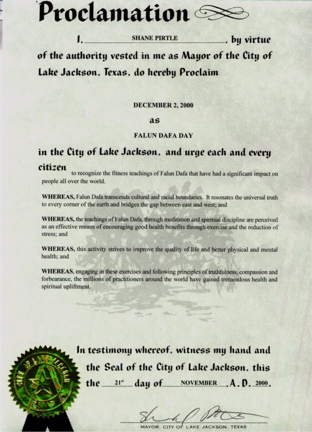 我,谢恩.帕托,以授予我的德克萨斯州杰克逊湖市市长的权力于此宣告2000年12月2日为杰克逊湖市