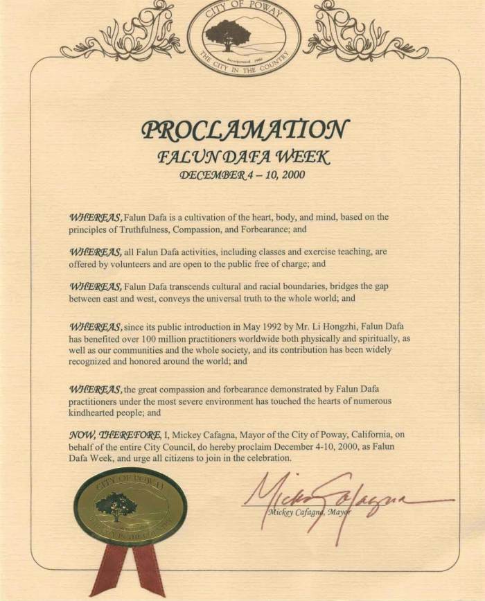 我,加利福尼亚州鲍威市市长米基.卡发那,代表全市议员,宣布2000年12月4日至10日为"法轮大法周"并鼓励全体市民共庆。