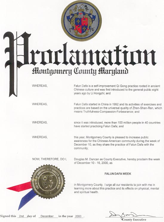 马里兰州蒙哥马利郡郡长宣布法轮大法周的公告译文如下: