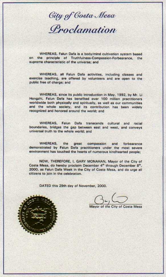 我,寇斯特麦瑟市(COSTA MESA )市长 盖利·穆南汗(GARY MONAHAN),宣布2000年12月4日至8日为寇斯特麦瑟市(COSTA MESA) 市“法轮大法周”并鼓励全体市民共同庆祝。