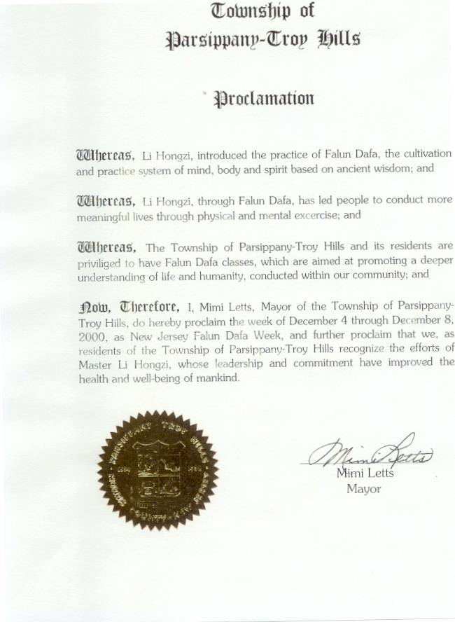 新泽西州帕瑟伯尼市市长Mimi Letts女士宣布2000年12月4-8日为帕瑟伯尼市“法轮大法周”,并号召全体帕瑟伯尼市人民和她一起对李洪志大师所付出的辛苦予以表彰。