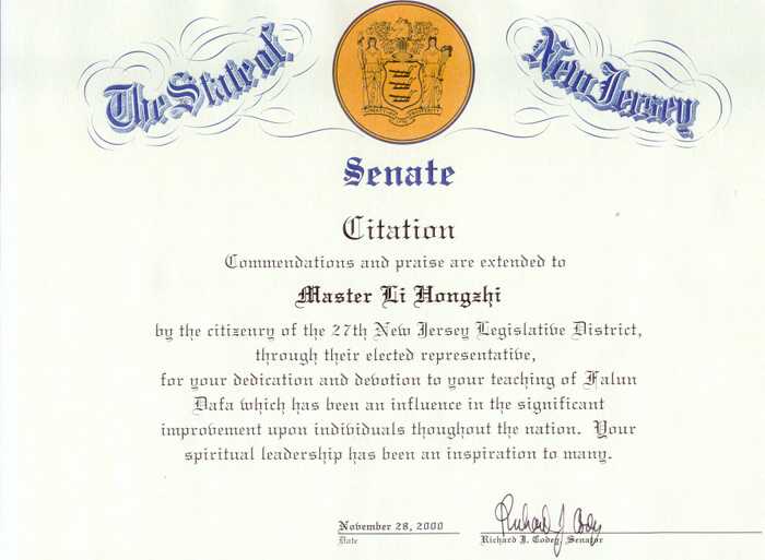 参议员Richard Codey先生在嘉奖令中写道:“新泽西州第27选区的全体人民通过他们的当选代表,对李洪志大师献身和致力于传授对整个国家的人民产生显著良好影响的法轮大法予以嘉奖和赞扬。您在精神方面的领袖地位是对众多人民的一个激励。”