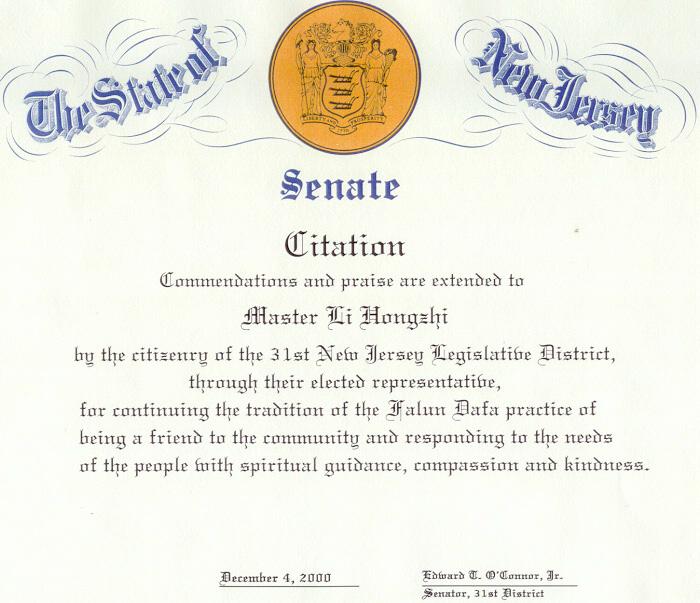 参议员Edward O'Connor, Jr.先生在嘉奖令中写道:“新泽西州第31选区的全体人民通过他们的当选代表,对李洪志大师坚持把法轮大法作为社区人民朋友的传统及响应人民在精神指导,善良和友好等方面的需要予以嘉奖和赞扬。”