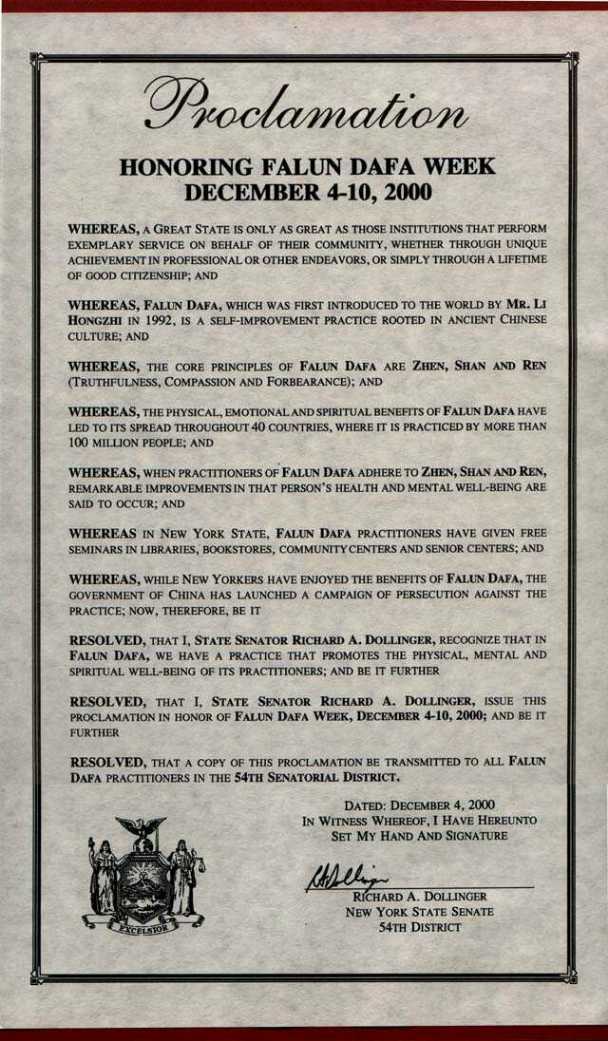 纽约州议员褒奖法轮大法并宣布“法轮大法周”