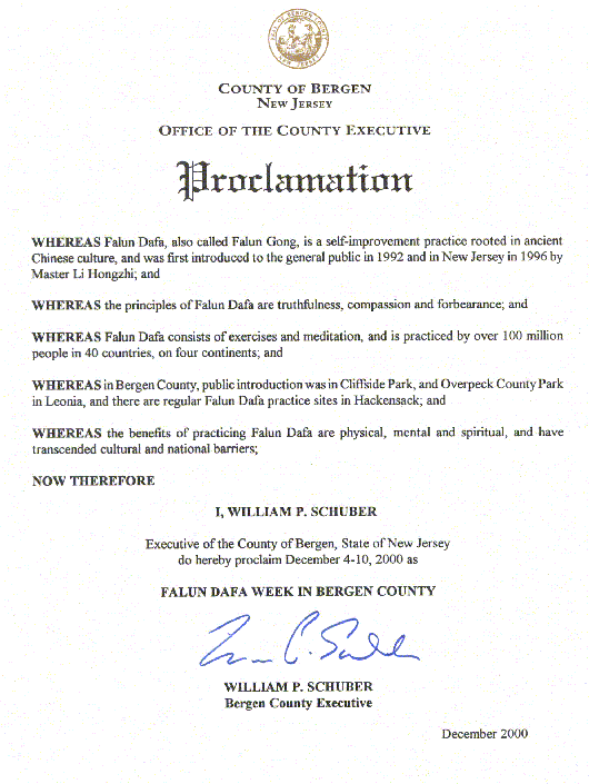 因此, 我,William P. Schuber, 新泽西州博根郡行政执行官在此公告,2000年12月4日至10日为博根郡法轮大法周。