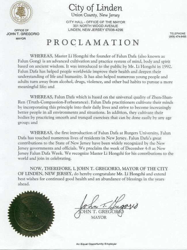新泽西州林登市市长John Gregorio先生发布公告:宣布2000年12月4-8日为林登市“法轮大法周”。