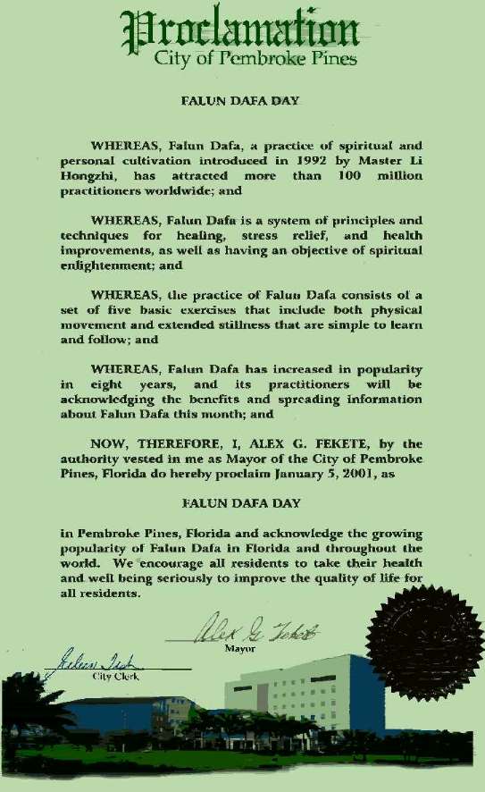 佛罗里达州潘布鲁克市宣布“法轮大法日”