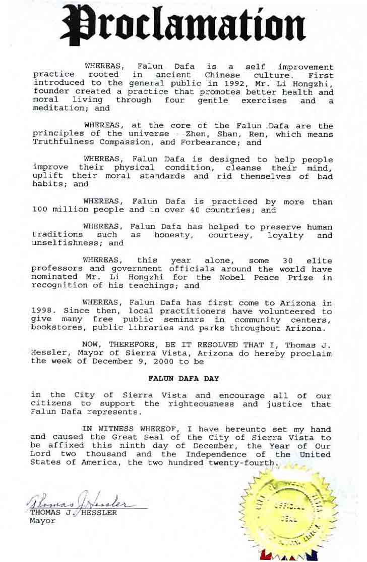 因此,现在我,汤姆斯、何斯乐,亚利桑那州西亚诺,威斯他市市长,宣布12月9日2000年的这一天为西亚诺,威斯塔市的法轮大法日
