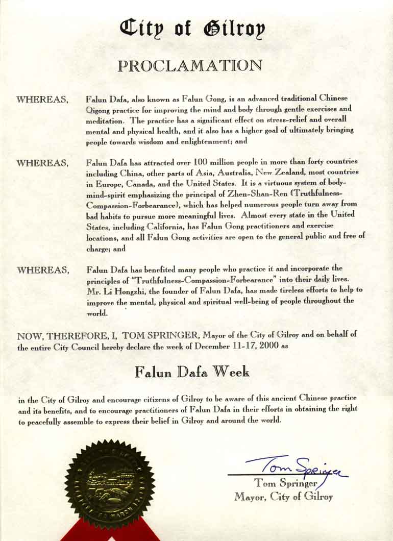 并鼓励吉尔瑞的市民了解这种古老的中国气功及其益处,并对法轮大法学员为争取和平集会及表达信仰的权利在吉尔瑞市和世界各地所作出的努力表示鼓励。