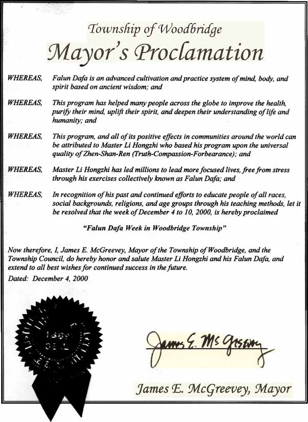 因此,现在,我,吉姆斯·麦格瑞维,木桥市市长,和市议会,在此向李洪志大师和他的法轮大法致敬和嘉奖,并为未来的继续成功致以最良好的祝愿。