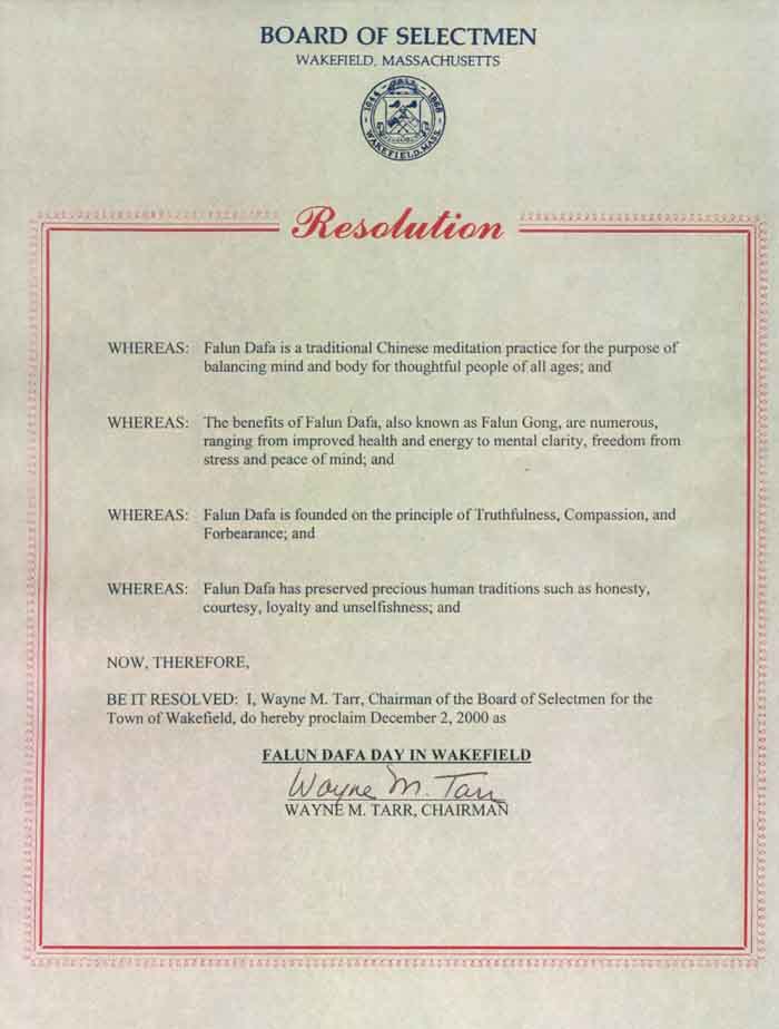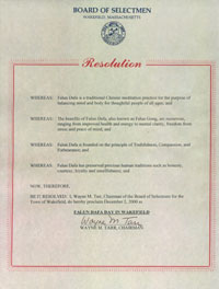 【明慧网】 麻省威克费德(Wakefiled)镇代表议会近日通过了褒奖法轮大法的决议,并选定二零零零年十二月二日为该镇的法轮大法日。