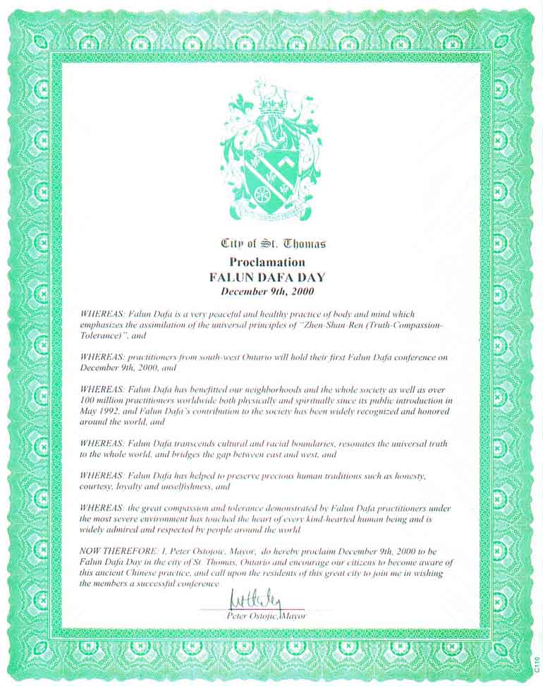 【明慧网】 十二月九日北美五大湖区法轮大法心得交流会在密西根大学召开,加拿大圣.涛姆斯市特地颁发了“圣.涛姆斯法轮大法日”褒奖。