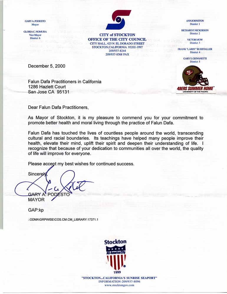 作为斯陶克顿市市长,我很荣幸地赞颂你们对提倡通过法轮大法的修炼而达到更健康和有意义的生活所作出的承担。