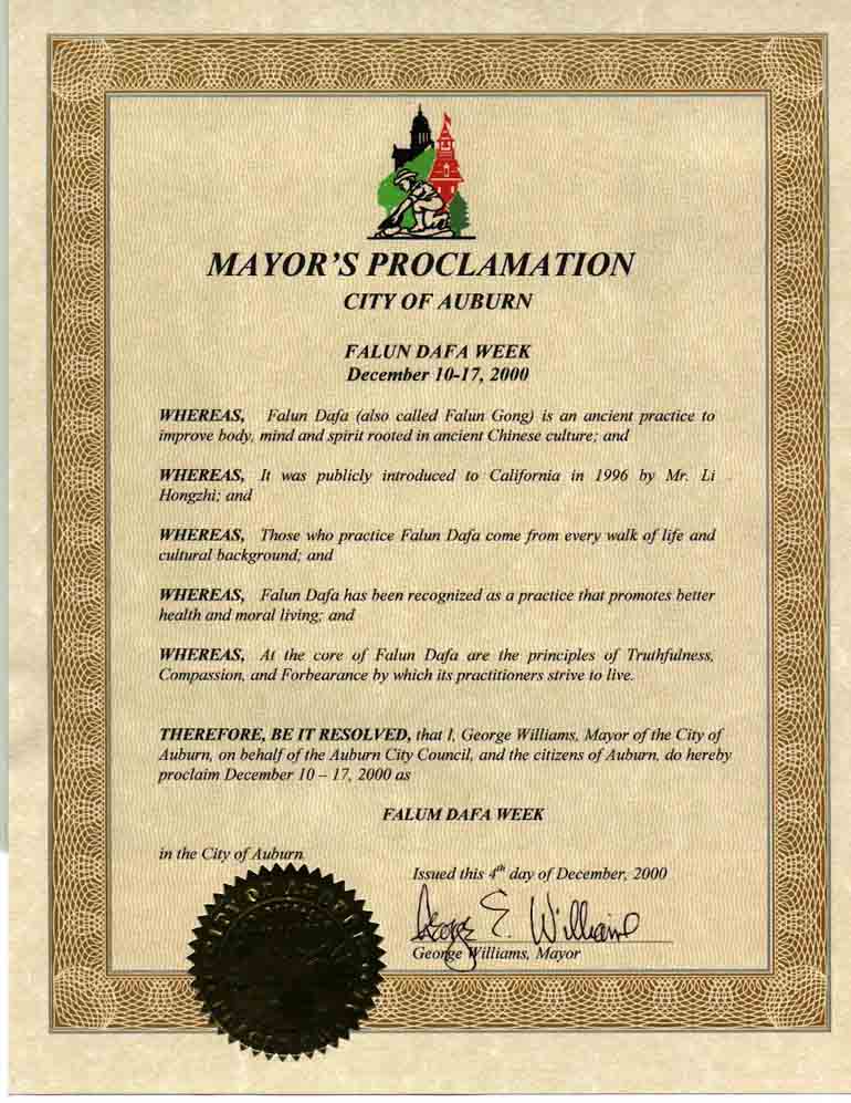 所以,我,乔治 维林姆斯,奥本市市长,代表全体市议会在此宣告,2000年12月10日至17日为奥本市的法轮大法周。