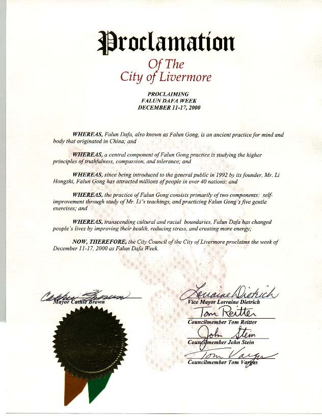 所以,现在,立物茂市议会,在此宣告,2000年12月11日至17日为立物茂市的法轮大法周。
