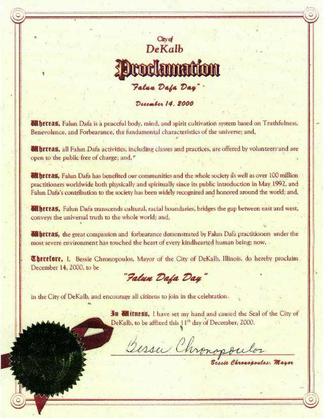 12月11日,在伊州达卡巴(DEKALB)市议会会议上,市长贝丝.科龙那普路斯宣读了对法轮大法的嘉奖状,并宣布12月14日为伊州达卡巴市"法轮大法日"。在嘉奖状中市长说:“……法轮大法学员在最严厉的环境中所表现出的大善大忍打动了所有善良人的心”。