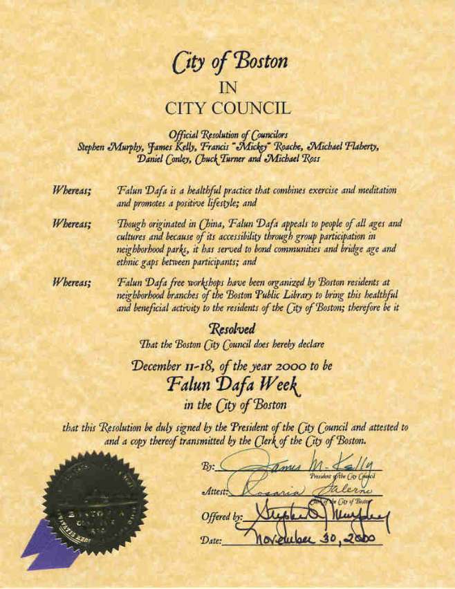 鉴于:多次法轮大法免费介绍班由波士顿居民在临近的波士顿图书馆分馆举行以便使得波士顿的居民受益于这个健康有益的活动;在此