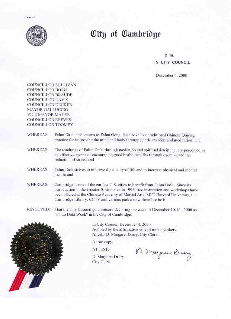 决议:市议会宣布2000年12月10日至16日为剑桥市“法轮大法周”。