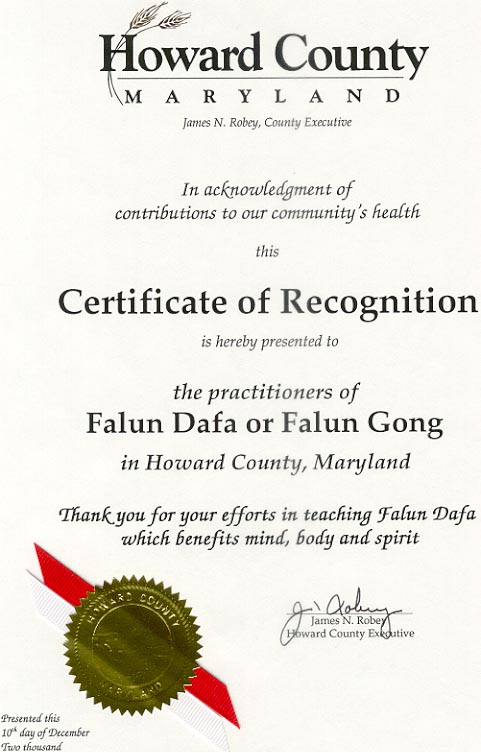 马里兰州哈伍德郡郡长授予法轮大法荣誉证书