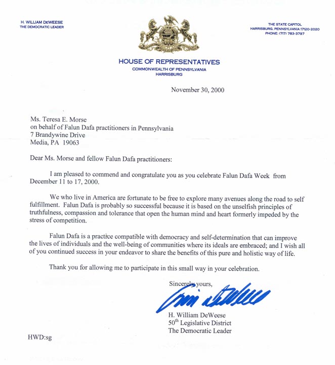 【明慧网】 宾西法尼亚州第50区国会议员H. 威廉 德维西(congressman H. William DeWeese)祝贺法轮大法周(2000年12月11日--17日)