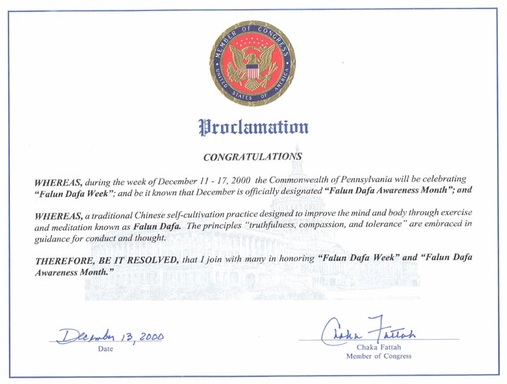 【明慧网】 宾州国会议员查卡.法塔(Chaka Fattah)祝贺法轮大法周(2000年12月11日--17日)和法轮大法意识月(2000年12月)。