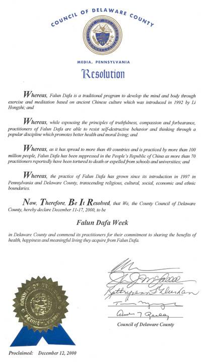 【明慧网】 宾西法尼亚州特拉华县宣布法轮大法周(2000年12月11日--17日)