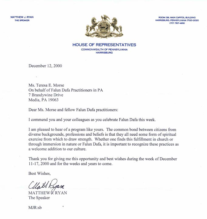 【明慧网】 宾州海瑞斯堡国会发言人马修 J. 仁恩(Matthew J. Ryan)给予法轮大法周(2000年12月11日--17日)的赞扬信
