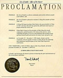 因此,现在,我,保罗·帅尔,西雅图市市长,宣布1999年11月29日至12月5日为西雅图李洪志及法轮大法日,并鼓励所有市民与我一起向这个杰出人物的精神和奉献表示敬意。