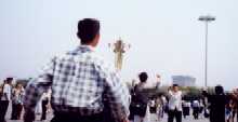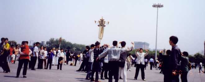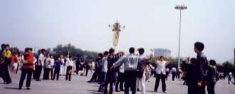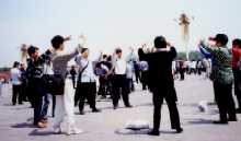 上图:2000年5月13日中午, 天安门广场国旗前10位学员开始炼“法轮桩法”庆祝节日。