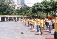 约200名大法学员先后参加了上午在遮打花园、下午在尖东海滨公园、傍晚在九龙公园举行的集体炼功弘法活动。从海滨公园到九龙公园进行了庆祝游行。一部分学员参加了花车巡游。
