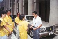 | 一∶在遮打花园集体炼功 | 二∶学员代表向立法会递交介绍法轮功资料 | 三:学员布置即将出发的花车 |