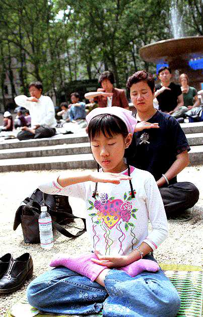 中午时分庆祝活动正式开始。首先由各种族学员依次用英文、西班牙文、法文、俄文和中文的代表用本国语言致贺词,接下来的集体功法演示吸引了很多人。有的路人找到讲法语或西班牙语的学员开始交谈;有的向学员索取中文的大法简介,并道出了一番心里话:我知道这个在中国是被禁止的,可是有那么多人在炼,一定有他的好处。当他得知每个周末都有法轮功的炼功人到他家附近的公园里炼功时,一再地说:“太好了!太好了!”;还有的人说,炼功动作都是自学的,今天是第一次见到这么多炼法轮功的人,一份找到归属的心情溢于言表;有个西方人拿着手里的大法简介说:“你别只是给我简介,跟我介绍,告诉我现在去哪儿可以学呀?”虽然我们不知道这位过路人原打算去哪儿,可我们现在看到的是她站在那里认真地学着法轮功。在炼功场地的一角,有两个英文组、一个中文组及一个西班牙文组在教功。