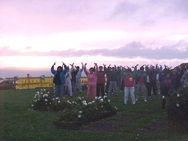 由于新西兰是第一个见到日出的国家,所以我们在奥克兰选择了依山傍水的Misson Bay 弘法炼功。 早上六点半,五、六十名东西方弟子趟着露水,在微熹的晨光中,迎着强劲的海风, 冒着蒙蒙的细雨,来到了Michael Savage Memorial at Bastion Point 公园山坡。约七时许, 在祥和的大法炼功音乐中,我们迎来了旭日东升,世界法轮大法日的第一道曙光。