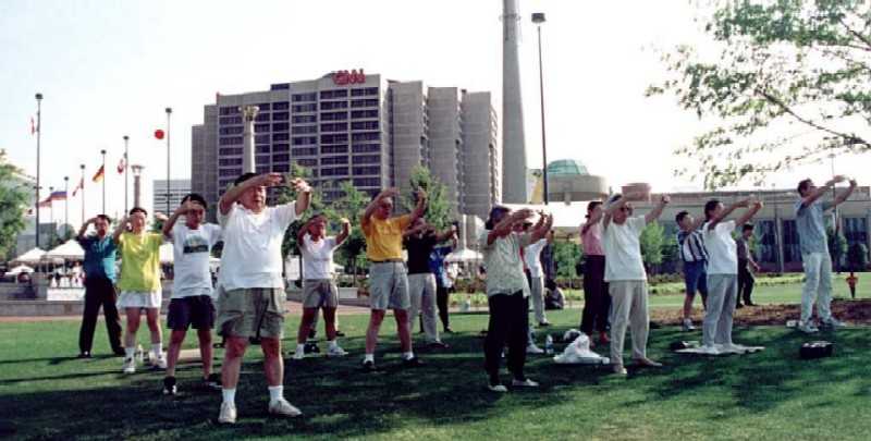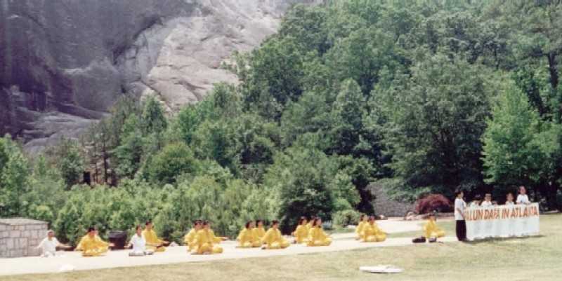 世界法轮大法日,亚特兰大学员分组分别在市中心的奥林匹克公园及游人不断的石头山公园炼功弘法。