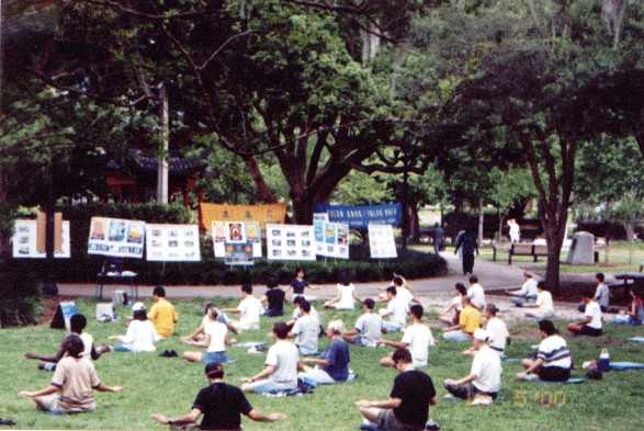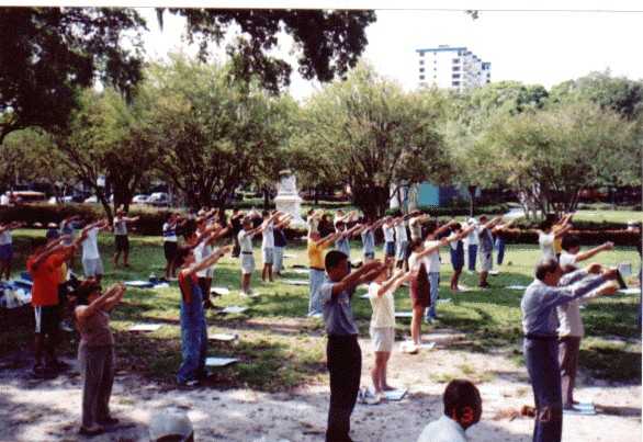 图片说明:世界法轮大法日,佛罗里达学员50多人在奥兰多Lake Eola公园集体炼功、演示功法。