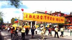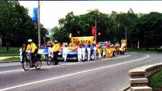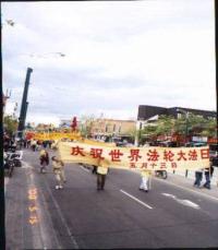 14日下午两点正,法轮大法修炼群众的游行队伍缓缓地从议会大楼后面的皇后公园走出来。经过学院街,然后浩浩荡荡地从热闹的中区中国城通过。