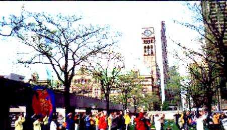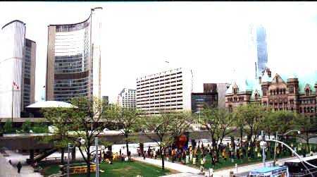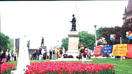 5月13日的清晨,加拿大多伦多刚刚经受了昨夜狂风暴雨的洗礼,淡淡的薄雾辉映着曙光的来临。当时针指向9点整,来自台湾,澳门,英国,新加坡,美国,中国大陆等国家和地区的大法弟子们与从加拿大各地赶来的大法弟子六百余人,汇集在多伦多议会大楼前,举行隆重的庆典。