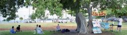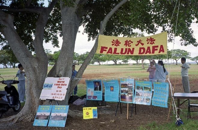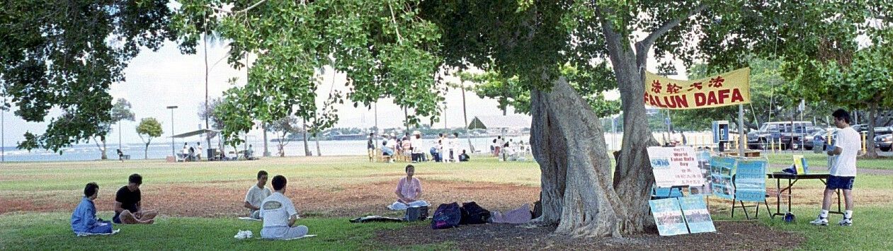 5月13日,夏威夷的法轮功学员欢聚在Magic Island, Ala Moana Beach Park,庆祝首届世界法轮大法日,同时向当地居民和游人弘法。
