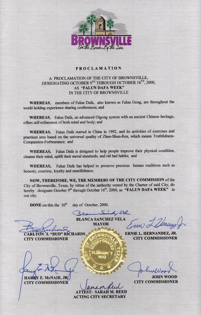 在此,我们德克萨斯州布朗斯维尔市委员会的成员以该市章程所授予的权力命名2000年10月9日至16日为我们市的“法轮大法周”。