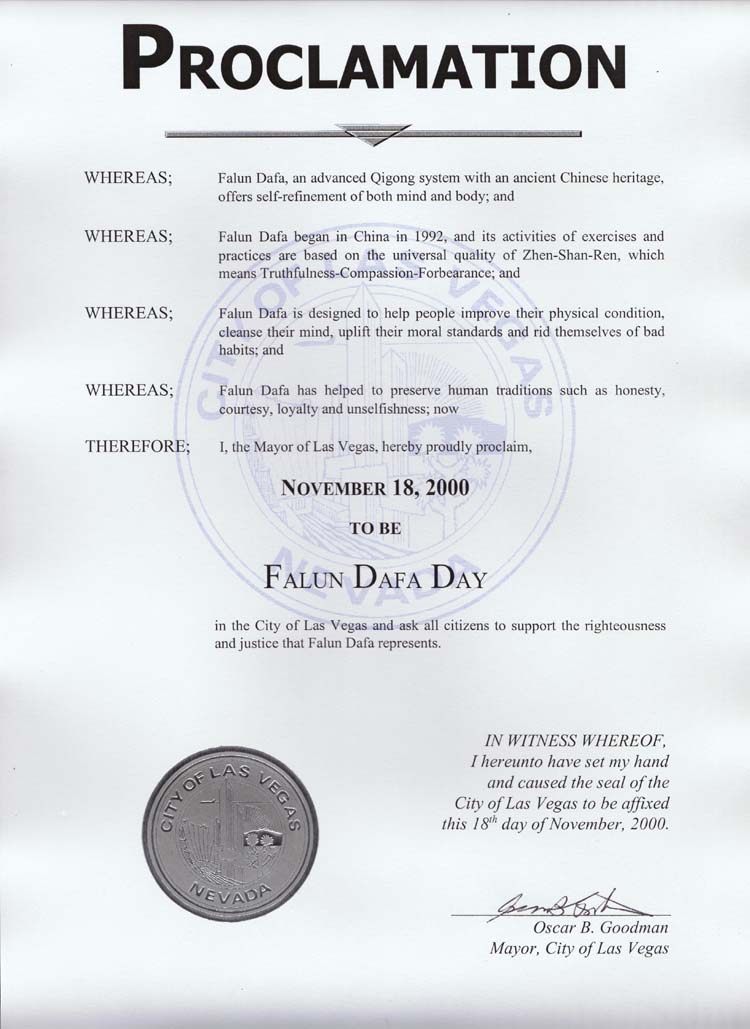 因此,现在,我,拉斯维加斯市市长,高兴地宣布2000年11月18日为拉斯维加斯市法轮大法日,并要求所有市民支持法轮大法所代表的正义和公道。