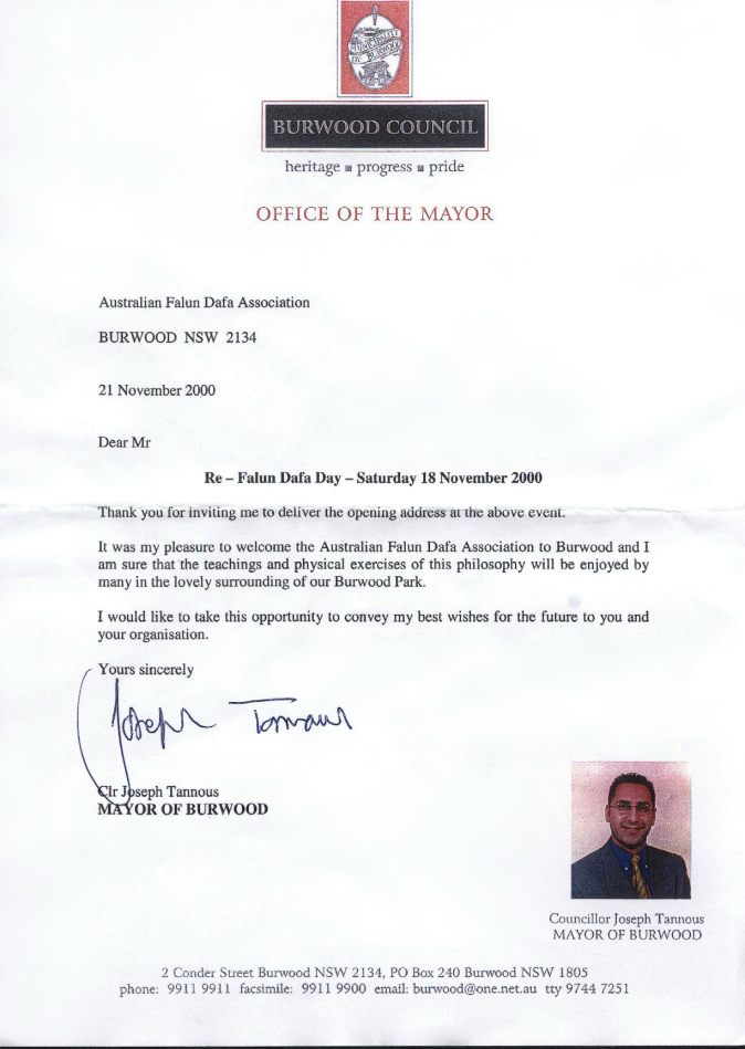 博物市市长亲自宣布11月18日为澳洲第一个“法轮大法日”,在剪彩的仪式上,市长在演讲时赞扬了法轮大法对社会的贡献,他感到应该从孩童时期就向他们传播法轮大法,可以使人们从小就身心健康,他认为自由人权是人类生活中最重要的事,但在中国发生迫害法轮功学员的事令人伤感,幸运的是我们生活在澳洲,而且现在是我们最高兴的时候,因为今天被命名为博物市的“法轮大法日”,另一位市议员也到场祝贺。