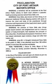因此,现在,我,奥斯卡·奥荻思,德克萨斯州奥瑟港市市长特此公告,宣布2000年11月4日(星期六)为奥瑟港市法轮大法日