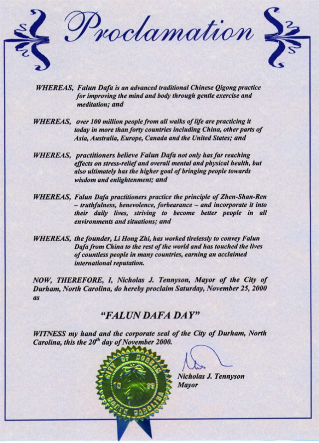 2000年11月20日,美国北卡州德伦市(Durham, North Carolina)市长颁发证书宣布11月25日为“法轮大法日”。