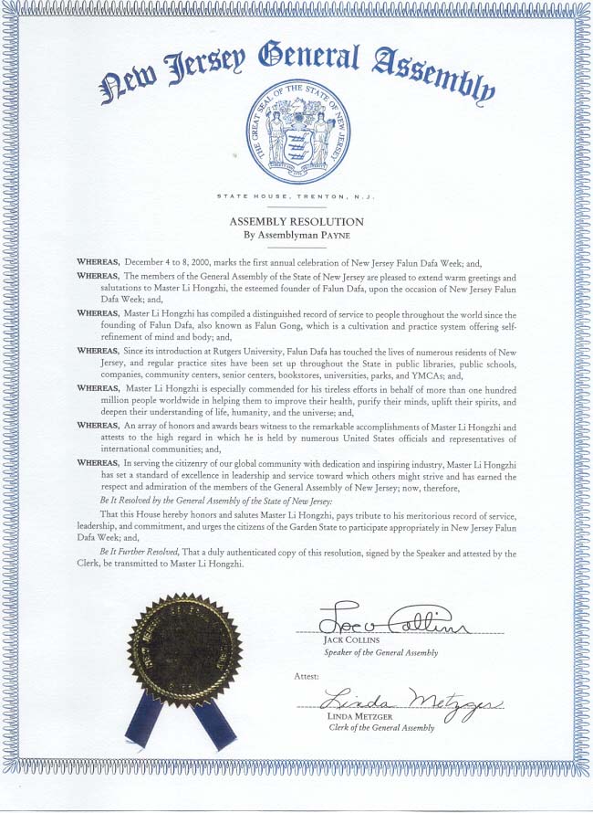 新泽西州众议院决议:向法轮大法创始人致敬!【外界褒奖】11/27/00