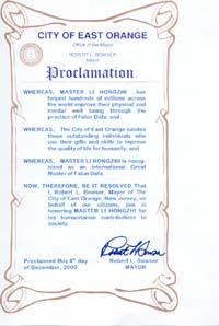 “为此,我,罗伯特.宝瑟,新泽西州东桔市市长,代表我们的市民,嘉奖李洪志大师对社会的贡献。”